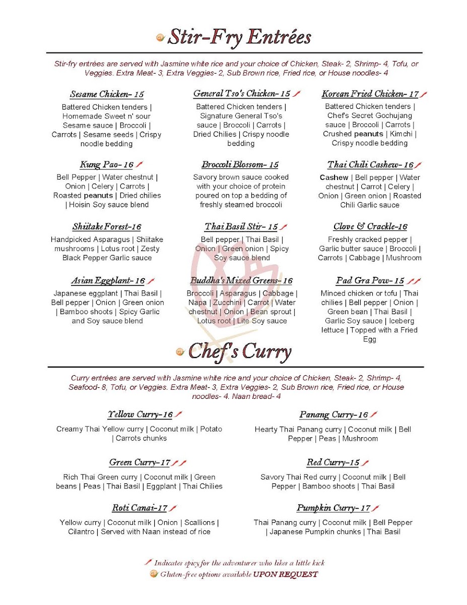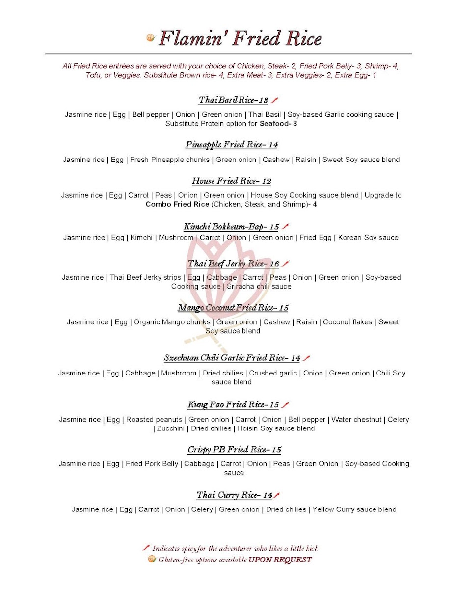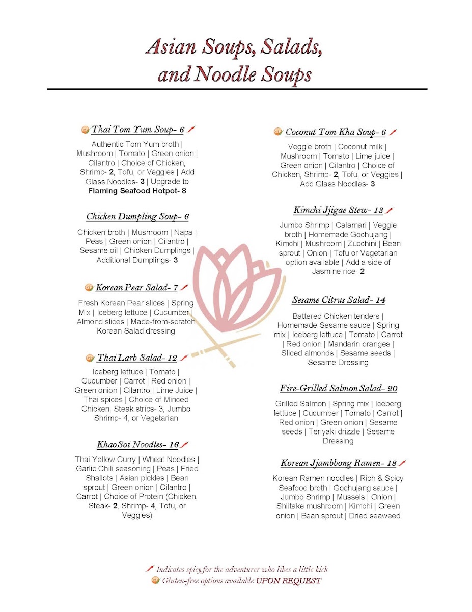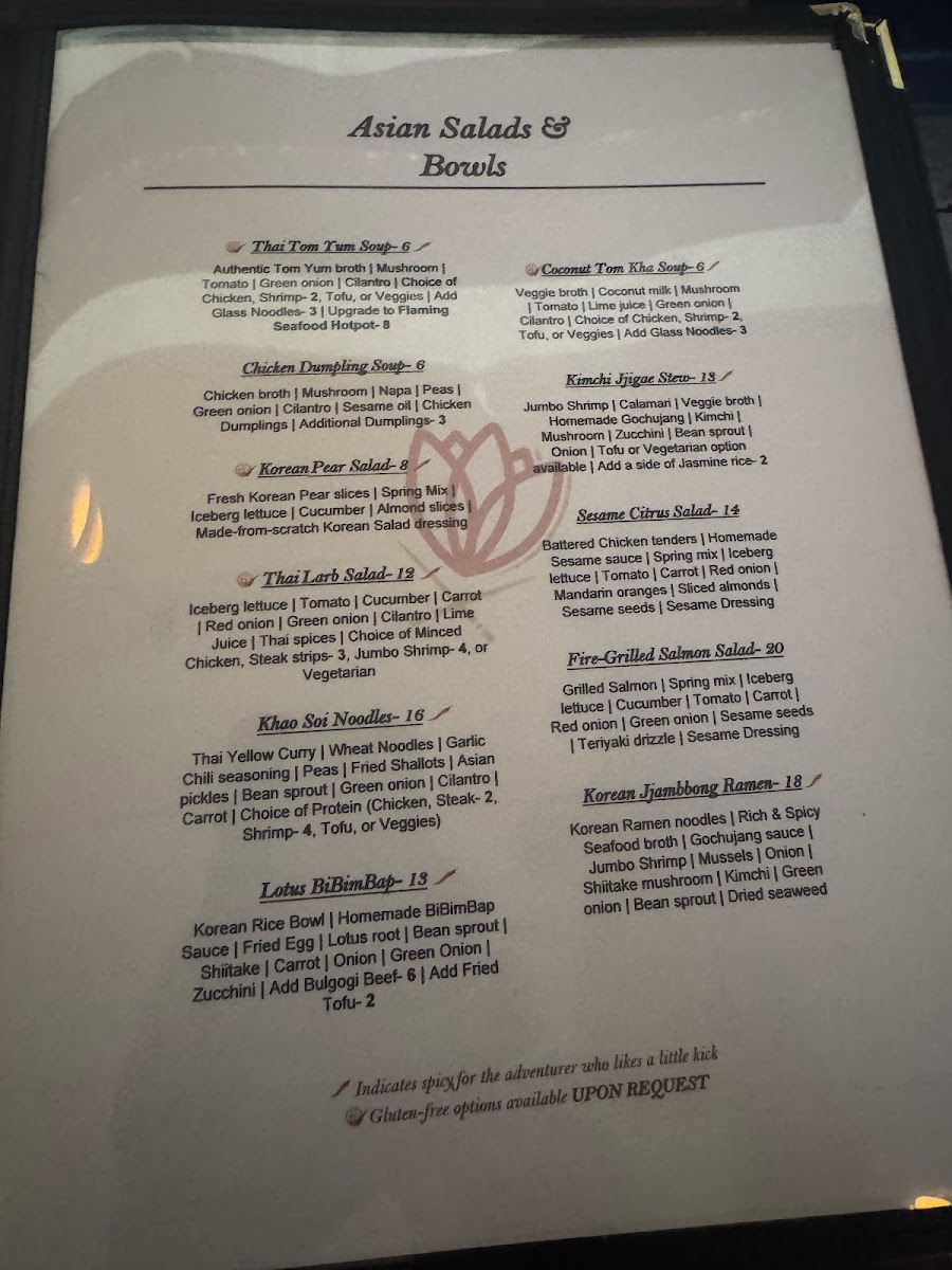 Guests can also enjoy unique specialties like Lotus buns filled with flavorful ingredients, or explore vibrant bowls such as bibimbap and spicy kimchi stew. The menu’s diversity reflects influences from Thai, Korean, Chinese, and broader Pan-Asian cuisines, offering something for those seeking familiar favorites as well as those interested in more adventurous tastes.