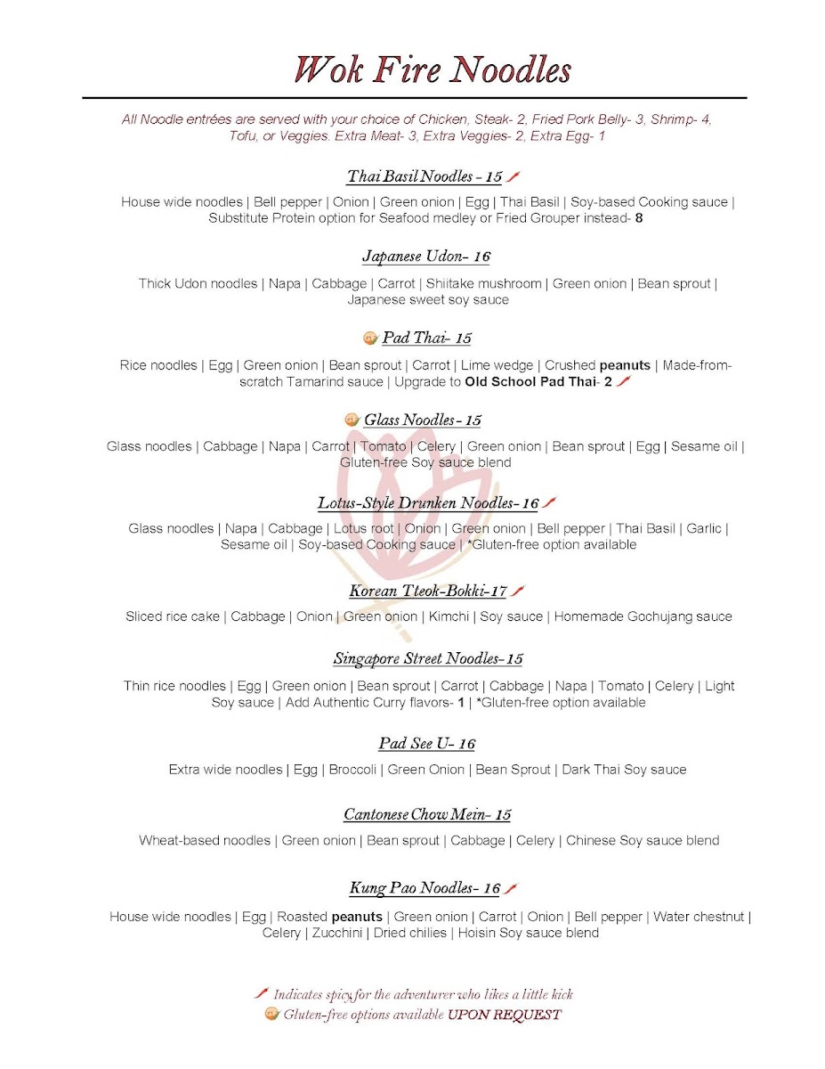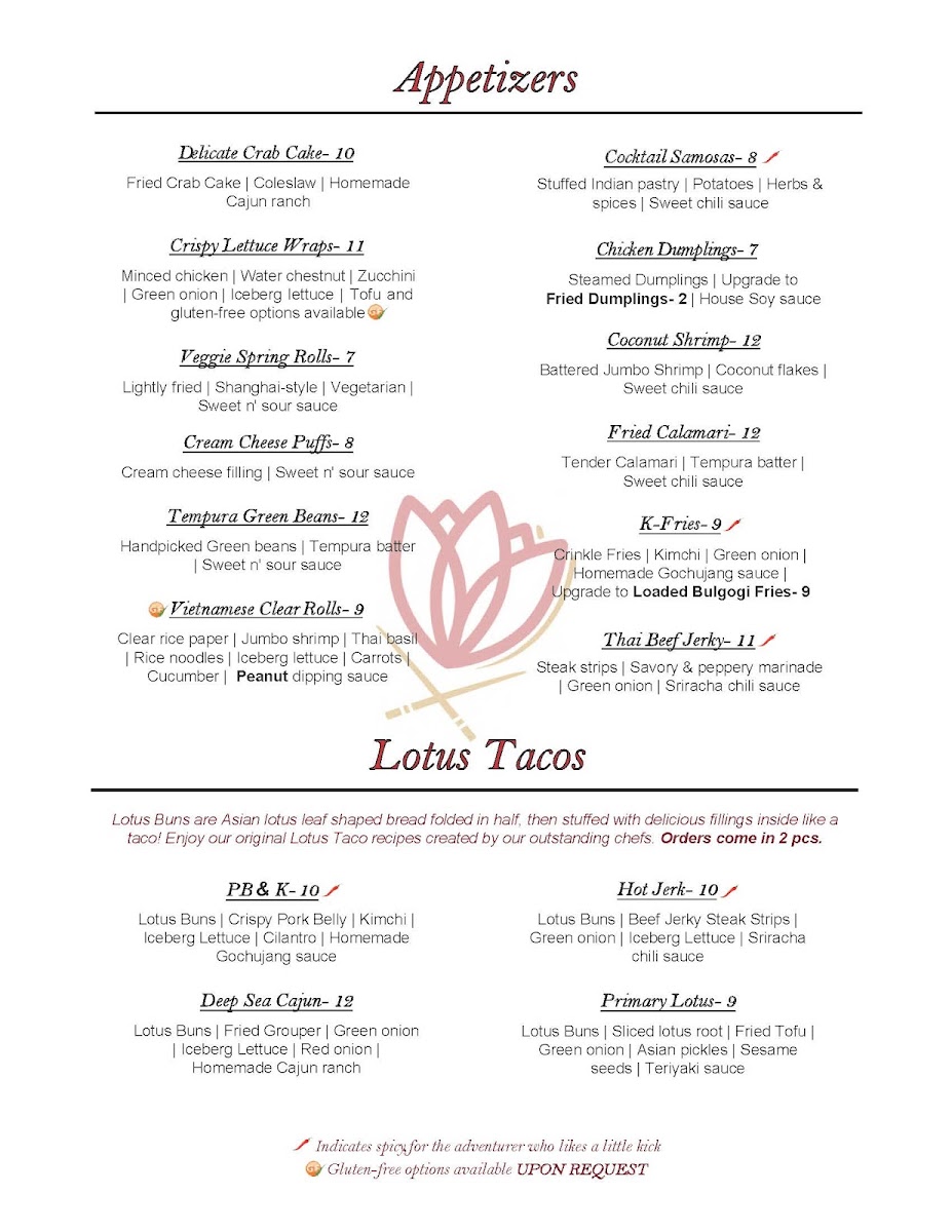 The menu at Lotus Asian Bistro offers a thoughtfully curated selection of Asian dishes that blend comfort with refined flavors. It balances approachable casual bites like crispy lettuce wraps and veggie spring rolls with more substantial plates such as Pad Thai, Panang curry, and Korean fried chicken, making it well-suited for a variety of dining occasions—from a relaxed lunch to a cozy dinner with friends or family.